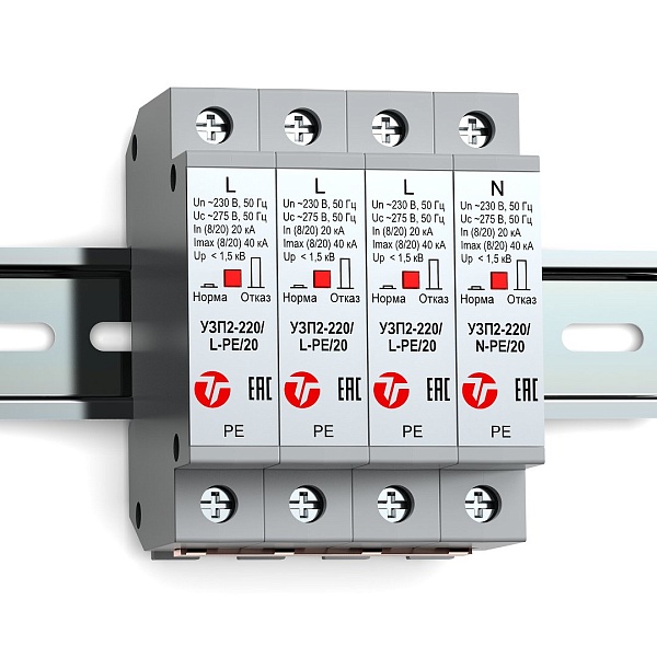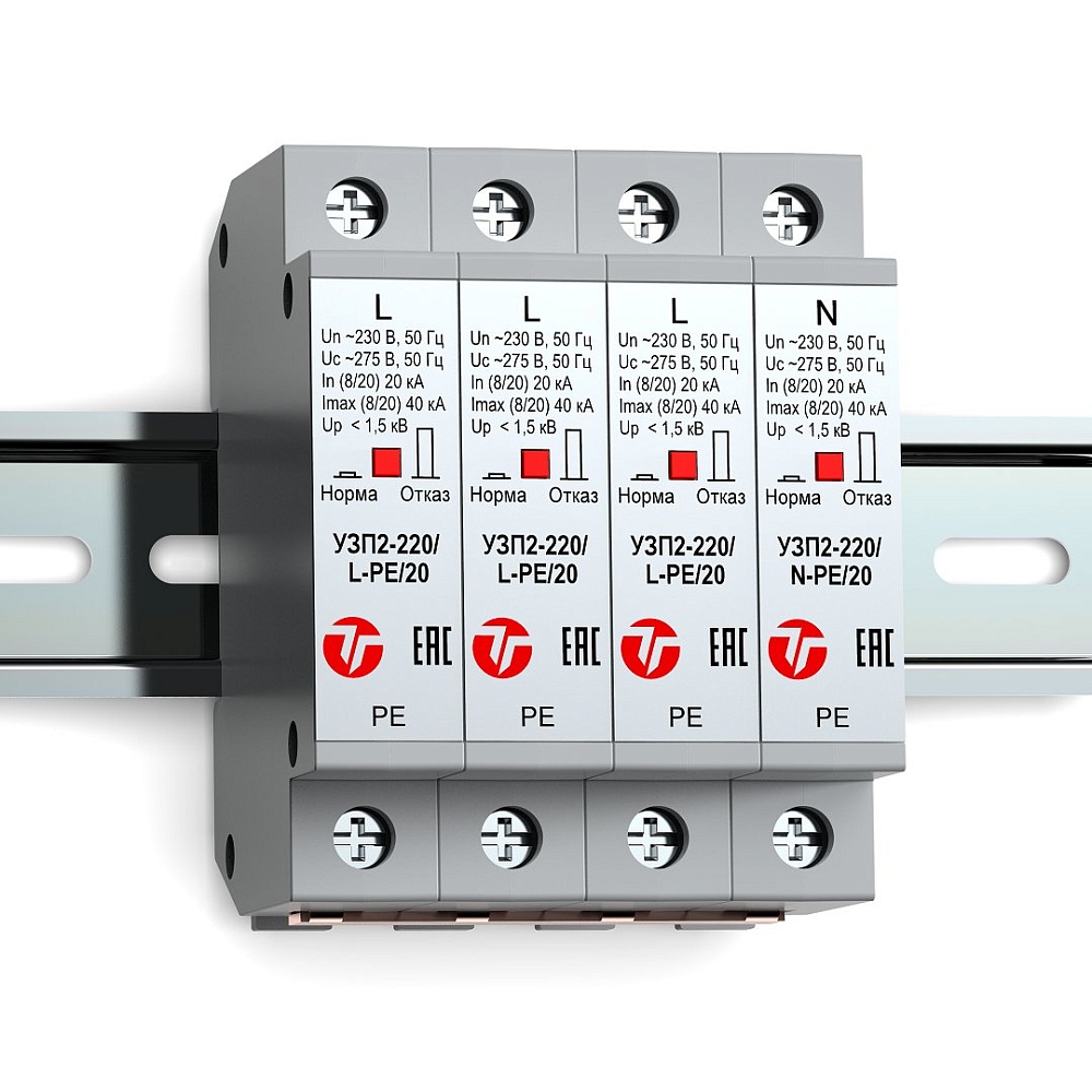 Четырехполюсное устройство защиты ограничительного типа класса испытаний II. Для защиты электрооборудования распределительных сетей 220 (230) В AC от импульсных перенапряжений. Применяется в трехфазных сетях с системой заземления TN-S (TN-C-S), ТТ. Визуальный индикатор состояния аварийного отключения. Крепление на DIN-рейку. - 55°С...+85°С, 92х63х72 мм.