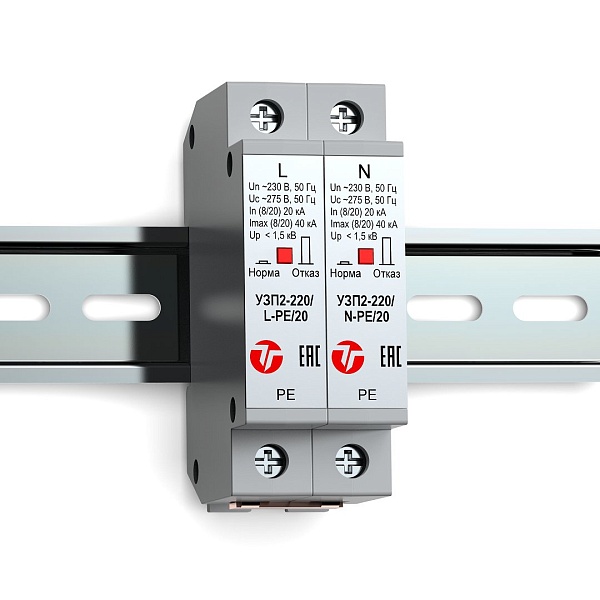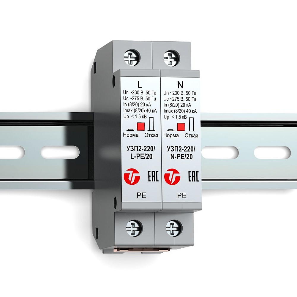 Двухполюсное устройство защиты ограничительного типа класса испытаний II. Для защиты электрооборудования распределительных сетей 220 (230) В AC от импульсных перенапряжений. Применяется в однофазных сетях с системой заземления TN-S (TN-C-S), ТТ. Визуальный индикатор состояния аварийного отключения. Крепление на DIN-рейку. - 55°С... +80°С, 92х63х36 мм.