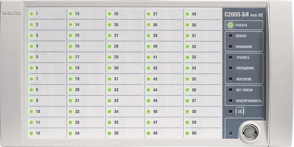 Блок индикации для работы в составе ИСО "Орион", 60 индикаторов состояния разделов, 7 индикаторов тревог и неисправностей, 1 индикатор состояния блока, 1 индикатор состояния раздела управляемого TouchMemory, RS-485, встроенный считыватель TouchMemory, U-пит.10,2...28,4 В, I-потр.200 мА (max), IP20, t-раб.-30...+50°С, габаритные размеры 340х170х27,5 мм