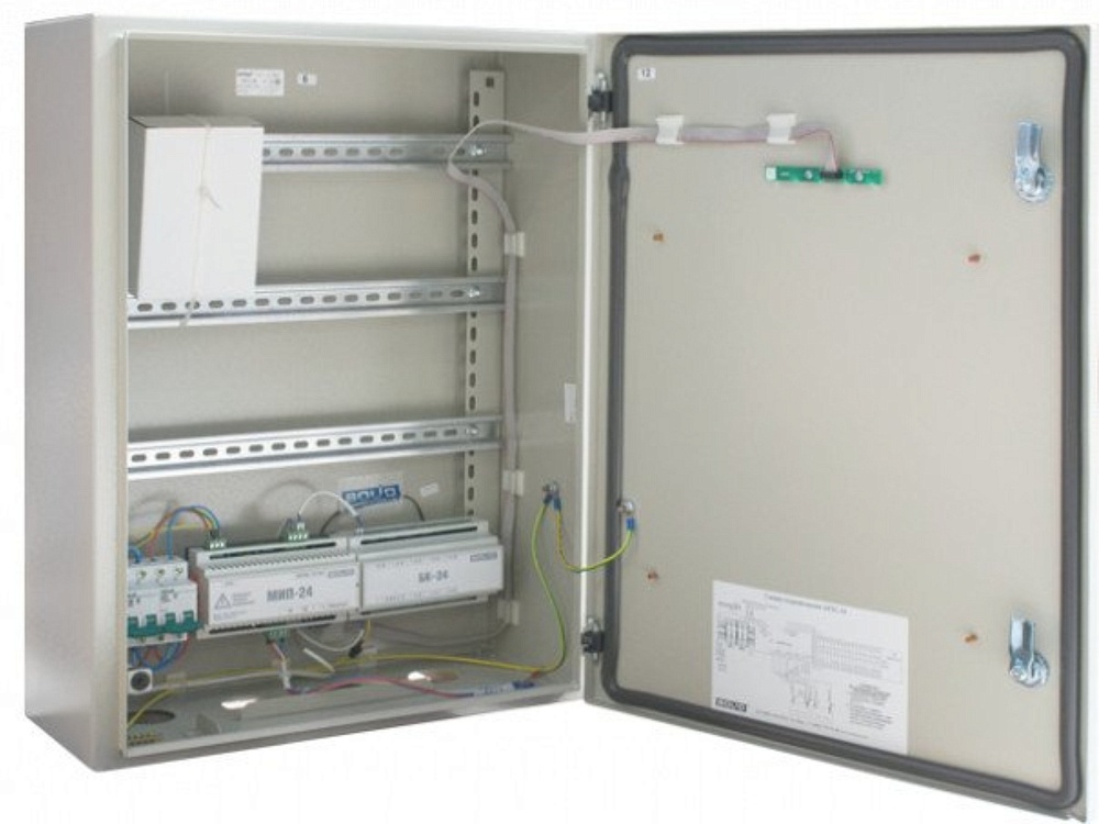 Шкаф для установки приборов системы "Орион" на DIN рейки с установленным ист.питания; 2 входа питания U-перем. 150…253 В; Р-потр. 120 ВА, I-потр. 0.8 А; 7 выходов U-пост. 13.6±0.6 В/ I-пост. 0.65 А (I-сумм. 3 А);7 выходов RS-485, выход оптореле "АВАРИЯ"; под 2 АКБ 12В/17 А*ч; IP54, клим.испол. О3, t-раб. -10...+40 °С, габ.размеры 650х500х220 мм. Внутри шкафа установлены: модульный ист. питания МИП-12 - 1 шт., блок коммут. БКА-12 - 1 шт., 1 х автом.выключ. 220В/16А "С", 1 х автом.выключ. 220В/3А "С". Возможна установка на дверь монтажного комплекта МК-1.
