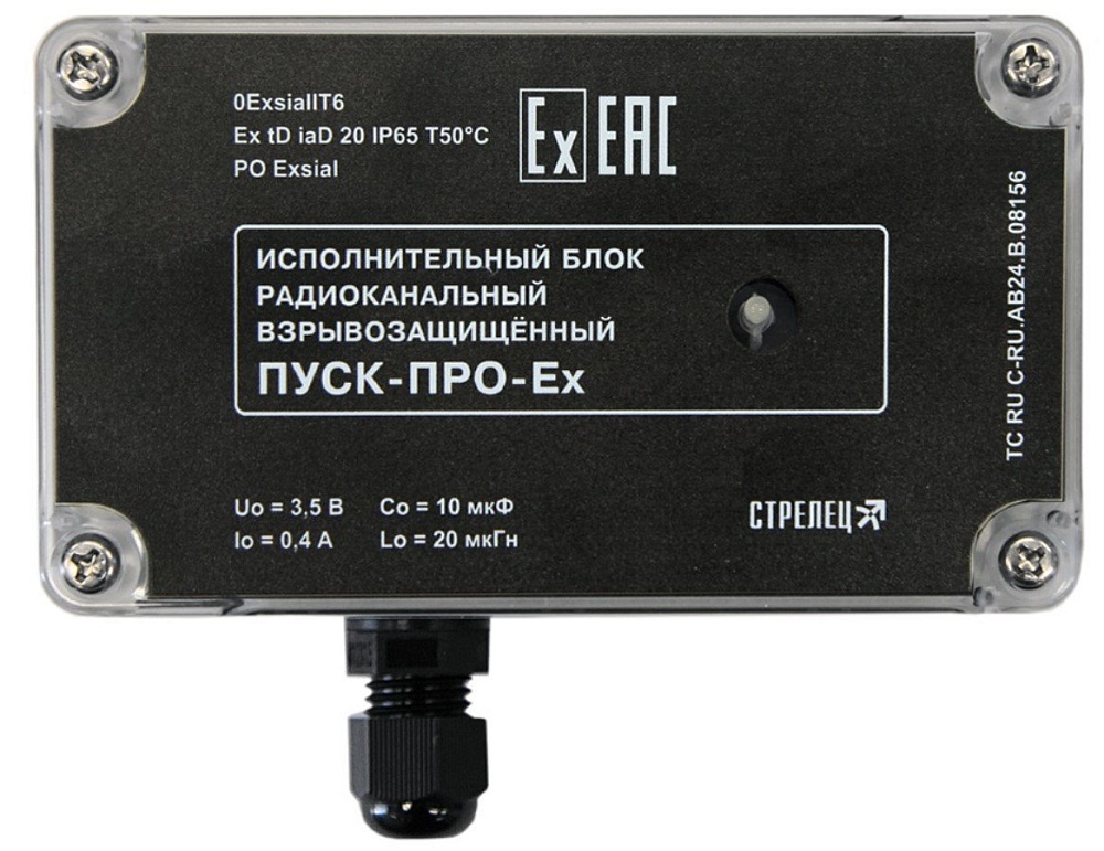 Блок исполнительный радиоканальный для работы в составе радиосистемы Стрелец-ПРО взрывозащищенный 0ExsiaIIT6 / Ex tD iaD 20 IP65 T50°C / PO ExsiaI, f-раб.868 МГц, дальность связи до 1200 м, элемент питания CR123A (основной и резервный), t-раб.-30…+55°С, 145x90x40 мм