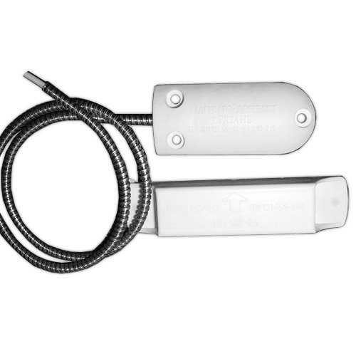 Магнитоконтактный для металлических поверхностей; контакты размыкаются при тревоге, 25 мм (контакты замкнуты), 70 мм (контакты разомкнуты); U-коммут.72 В, I-коммут.500 мА, P-коммут.10 Вт; IP55, t-раб.-50…+50°С, 90х40х10.4 мм (геркон), 130х30х20 мм (магнит). Кабель КСПВГ 2x0,2 в металлорукаве Ø6.2 мм 700 мм . Пластиковый корпус. 0.25 кг.