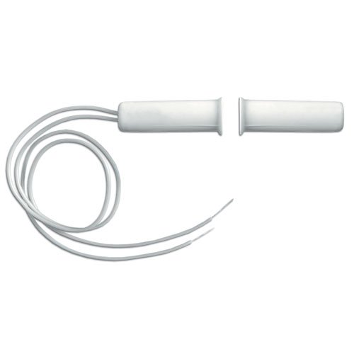 Магнитоконтактный; контакты размыкаются при тревоге, 10 мм (контакты замкнуты), 45 мм (контакты разомкнуты); U-коммут.72 В, I-коммут.250 мА, P-коммут.10 Вт; t-раб.-50…+50°С, Ø9 х 27.6 (геркон и магнит). Два провода по 160 мм. Пластиковый корпус. 0.013 кг.