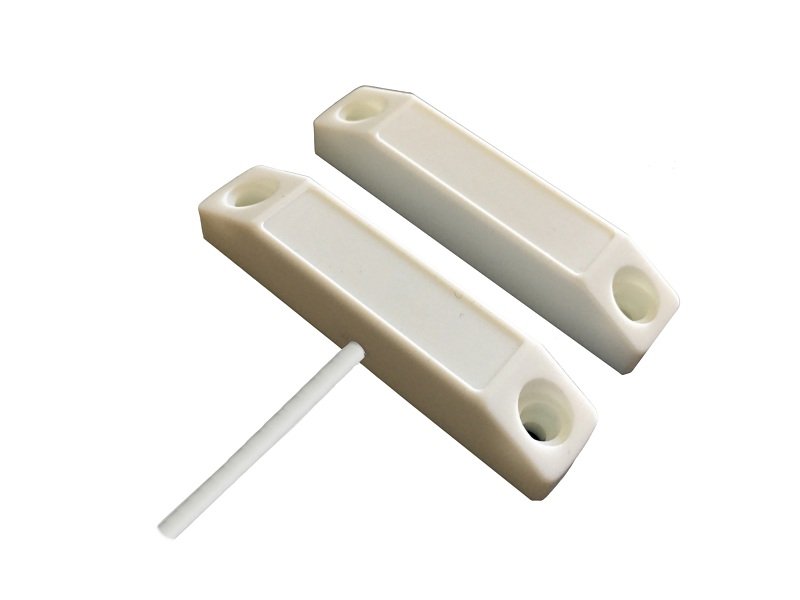 Магнитоконтактный для металлических поверхностей; контакты размыкаются при тревоге, 8 мм (контакты замкнуты), 25 мм (контакты разомкнуты); U-коммут.72 В, I-коммут.500 мА, P-коммут.10 Вт; IP55, t-раб.-50…+50°С, 66х13х13.3 мм (геркон и магнит). Кабель с двойной изоляцией и разъемом Molex 351840200 350 мм. Пластиковый корпус.