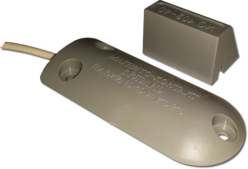 Магнитоконтактный для металлических поверхностей; контакты переключаются при тревоге, 14 мм (контакты замкнуты), 40 мм (контакты разомкнуты); U-коммут.36 В, I-коммут.100 мА, P-коммут.7.5 Вт; IP55, t-раб.-50…+50°С, 90х40х10.4 мм (геркон), 40х25х28.5 мм (магнит). Кабель 600 мм. Пластиковый корпус.