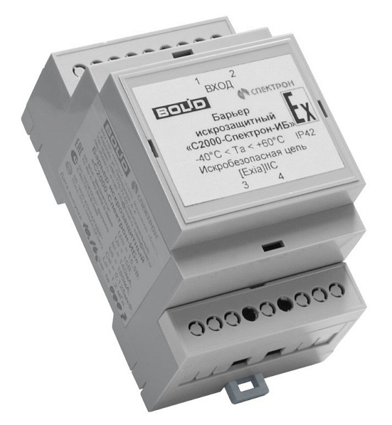 Барьер искрозащитный. Корпус из пластика, защита оболочки IP42. Питается по двухпроводной линии от «С2000-КДЛ», от -40 до +60 °С