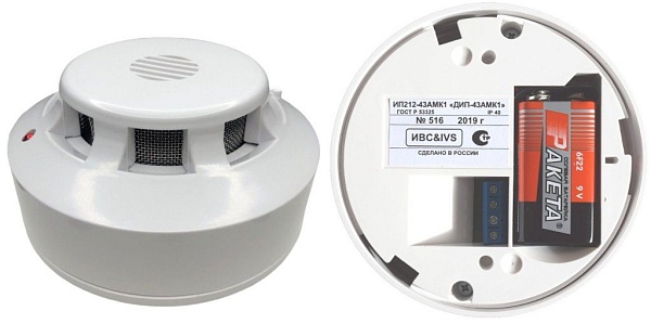 Извещатель пожарный дымовой оптико-электронный точечный, автономный, 93 дБ (серия длительных тонально-модулированных сигналов с постепенным нарастанием), четыре типа звуковых сигналов (Пожар, Внимание, Внешняя тревога и Разряд батареи), контакты опто-реле для подключения внешнего шлейфа (НЗ), элемент питания 9 В "Крона" (в комплекте), t-раб.-10...+55°С, 100х50 мм