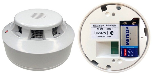 Извещатель пожарный дымовой оптико-электронный точечный, автономный, 85 дБ (серия длительных тонально-модулированных сигналов с постепенным нарастанием), четыре типа звуковых сигналов (Пожар, Внимание и Разряд батареи), элемент питания 9 В "Крона" (в комплекте), t-раб.-10...+55°С, 100х50 мм