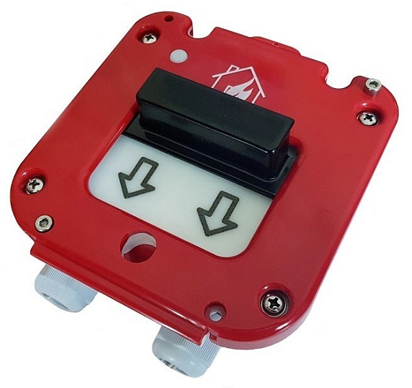 Извещатель пожарный ручной, светов.индикация; U-пит.9...30В, I-потр.30мкА; IP66, tраб.-60...+60°С, 129х158х72 мм. Приводится в действие опусканием вниз в направлении стрелок приводного элемента (ручки). Пластиковый ввод 11-17 мм