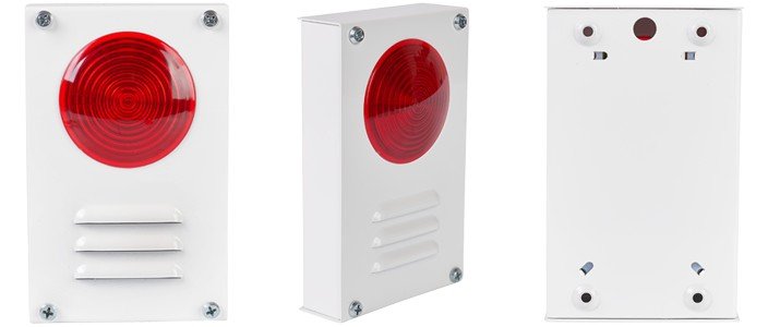 Светозвуковой, красного цвета, раздельное включение; 110 дБ, U-пит.24В, I-потр. 20мА(свет) 37мА(звук); IP52, t-раб.-30...+55°С, 125x78x46 мм. Антивандальный металлический корпус