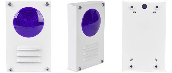 Светозвуковой, синего цвета, раздельное включение; 110 дБ, U-пит.12В, I-потр. 20мА(свет) 57мА(звук); IP52, t-раб.-30...+55°С, 125x78x46 мм. Антивандальный металлический корпус