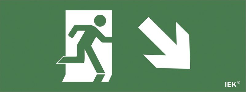 Самоклеящаяся этикетка "Фигура/стрелка вниз вправо" для ДПА IP20/54, размер знака 240х90 мм, подходит для нанесения на аварийные светильники ДПА 2101, 2104, 2105, 5030, 5032, 5040, 5043, цвет зеленый