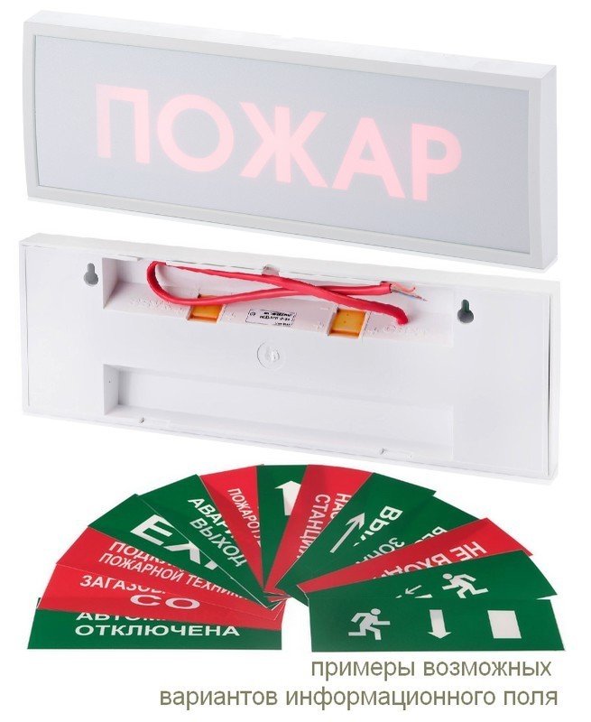 Оповещатель пожарный световой, светодиодный, пласт.рамка, скрытая надпись; U-пит. номин. 12...36 В, I-потр. ≤20мА, IP54, t-раб.-50...+55°С, габ. размеры 300х100х25 мм.