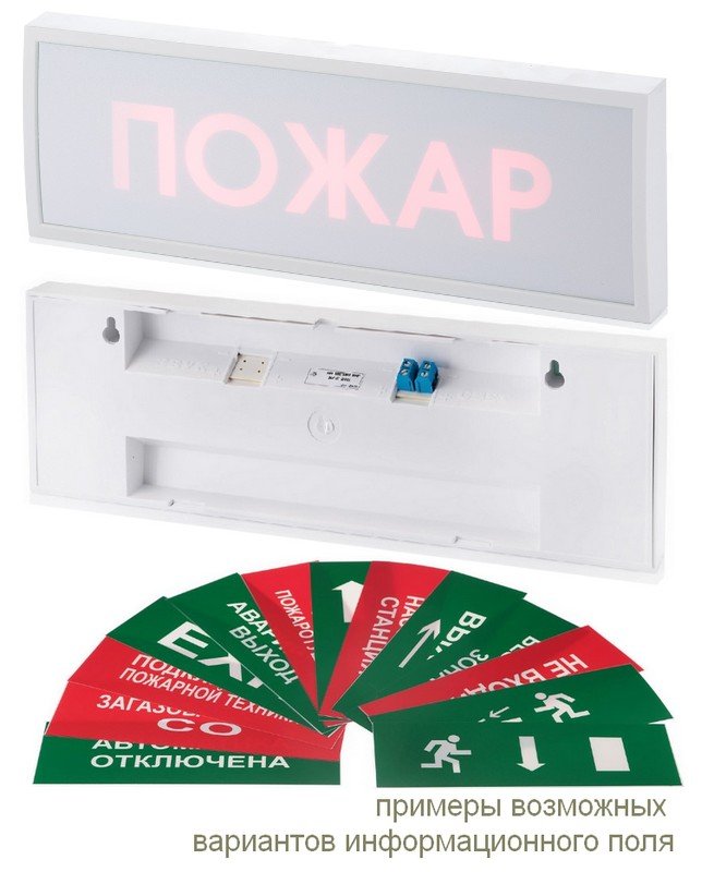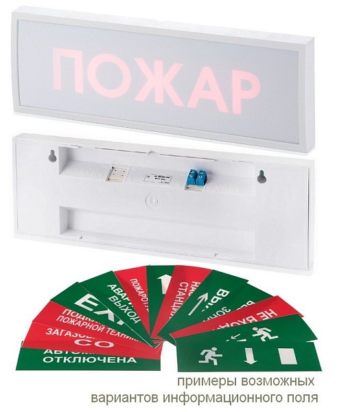 Оповещатель пожарный световой, светодиодный, пласт.рамка, скрытая надпись; U-пит. номин. 12...36 В, I-потр. ≤20мА, IP41, t-раб.-10...+55°С, габ. размеры 300х100х25 мм.