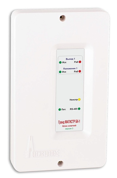 Блок ключей управления клапанами; 1 выход управления с контролем, 2 ШС контроля положения; RS-485; U-коммут.10...16/21...28 В, I-коммут.3 А; U-пит.12/24 В, I-потр.80 мА; IP40, t-раб.-30...+55°С, 200х118х43 мм