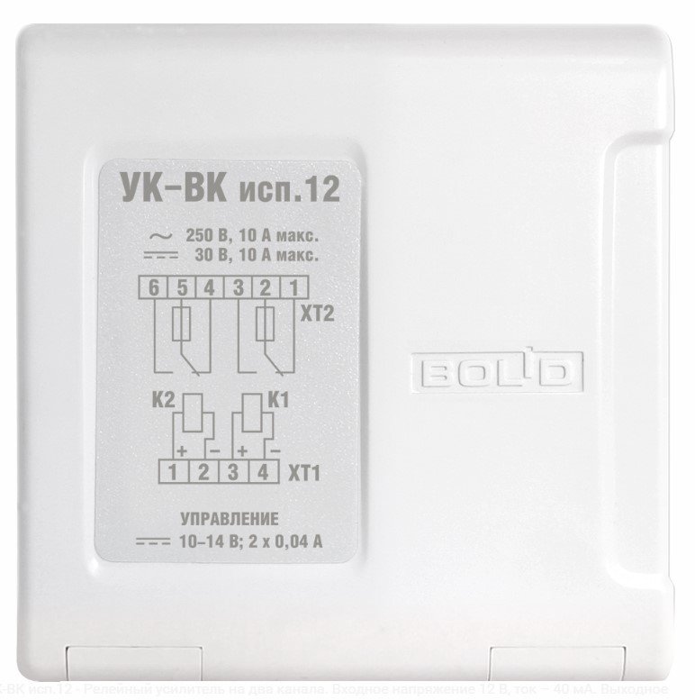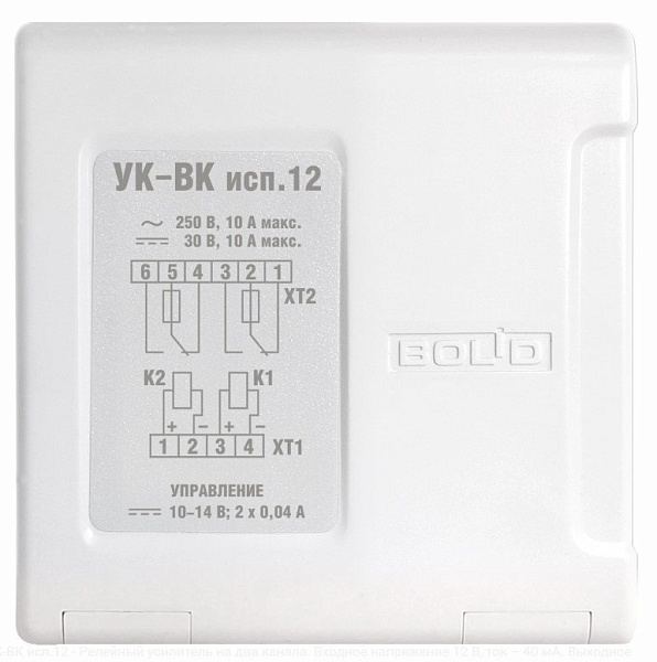 Устройство коммутационное; 2 реле, контакты на переключение; U-упр.12 В; I-упр.40 мА; U-коммут.до 250В; I-коммут.до 10 А; IP30; t-раб.-30...+50°С; 102х107х39 мм. На DIN рейку.