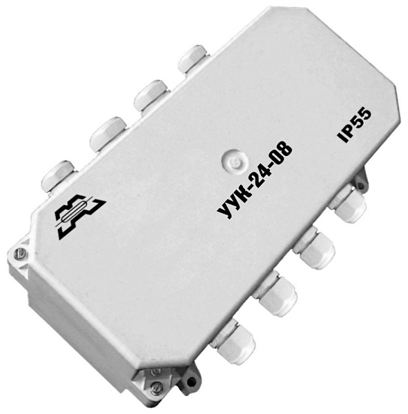 Блок релейный, 8 реле, контакты на переключение; U-упр. 24 В; I-упр. <55 мА; U-коммут. до 250В; I-коммут. до 8 А; IP55; t-раб. -30...+50°С; габ.размеры 302х225х93 мм. Клеммник T31, S² кабеля до 2,5мм². 8 герметичных кабельных вводов PG16 под кабель Ø 9...14 мм.