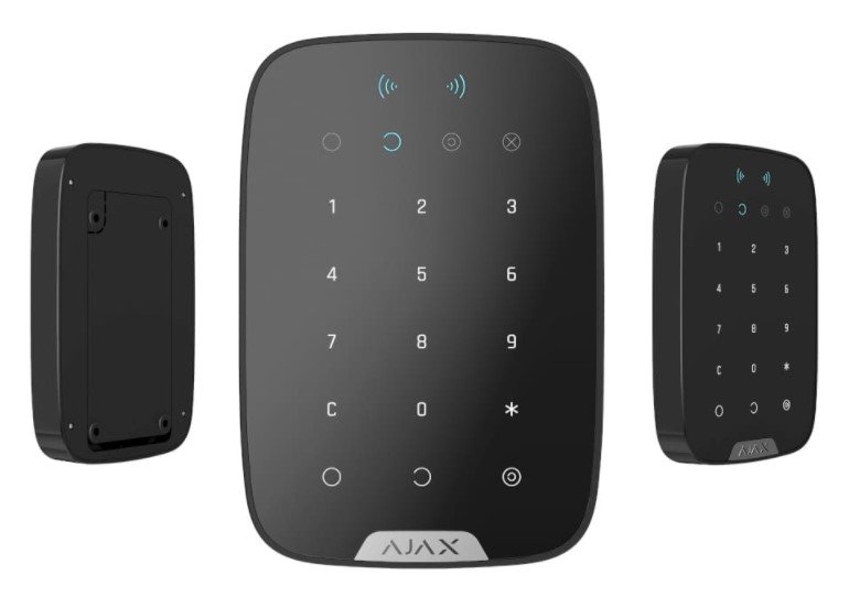 Клавиатура радиоканальная (протокол Jeweller) сенсорная с поддержкой защищенных бесконтактных карт и брелоков MIFARE® DESFire®; совместима с устройствами Hub Plus, Hub 2, Hub 2 Plus, ReX; дальность радиоканала до 1700м на откр.местности, встроенный датчик температуры, элем.питания АА (1,5 В)x 4шт в комплекте, t-раб. −10°С...+40°С, габ.размеры 165×113×20 мм, цвет черный