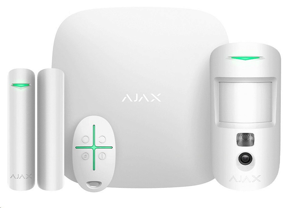 Стартовый комплект радиоканальной системы безопасности с фотоверификацией тревог в составе: "Ajax Hub 2" - 1 шт., централь с фотоверификацией тревог, до 100 радиоустройств, GSM-коммуникатор (2G), 2 SIM карты, Ethernet; "Ajax MotionCam" - 1 шт., внутренний датчик движения с фотокамерой для верификации тревог; "Ajax DoorProtect" - 1 шт., датчик открытия двери/окна; "Ajax SpaceControl" - 1 шт., брелок управления 4-х кнопочный. Все устройства белого цвета