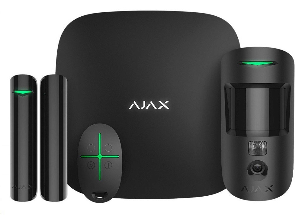 Стартовый комплект радиоканальной системы безопасности с фотоверификацией тревог в составе: "Ajax Hub 2 Plus" - 1 шт., централь с фотоверификацией тревог, до 200 радиоустройств, GSM-коммуникатор (LTE, 3G, 2G), 2 SIM карты, Ethernet, Wi-Fi; "Ajax MotionCam" - 1 шт., внутренний датчик движения с фотокамерой для верификации тревог; "Ajax DoorProtect" - 1 шт., датчик открытия двери/окна; "Ajax SpaceControl" - 1 шт., брелок управления 4-х кнопочный. Все устройства чёрного цвета