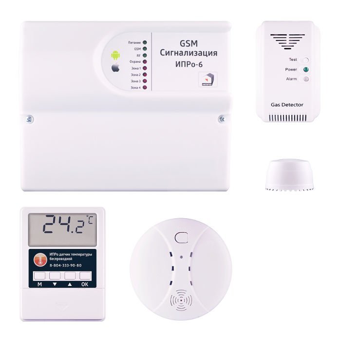 Готовый набор с беспроводными извещателями. В комплекте: ИПРо-6 - 1 шт, датчик дыма беспроводной - 1 шт, датчик протечки беспроводной - 1 шт, датчик утечки газа беспроводной - 1 шт, беспроводной датчик температуры - 1 шт, АКБ - 1 шт