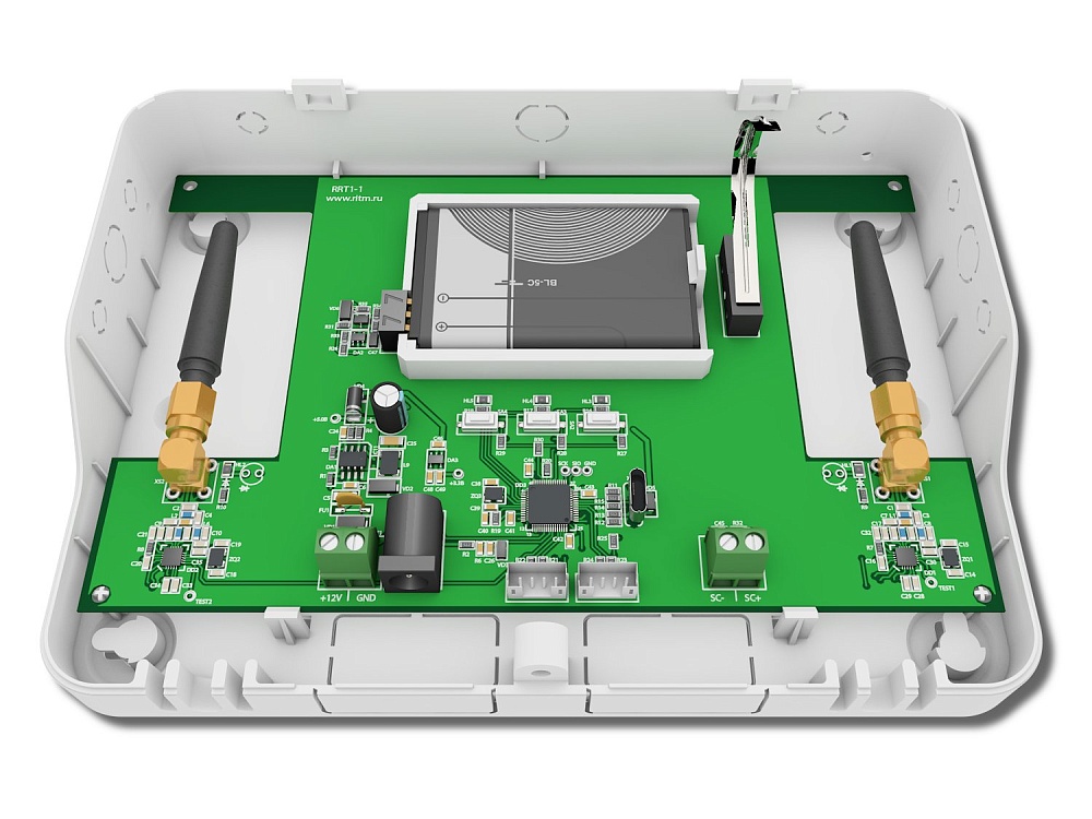 Ретранслятор для работы с радиоканальными извещателями компании Ритм, f-раб.433,075...434,775 МГц, 7 каналов, разъем антенны SMA, дальность связи до 800 м, 1 ШС, MicroUSB, U-пит.12 В, I-потр.260 мА, резервный источник питания АКБ BL-5C, t-раб.-30...+50°С, 170х120х40 мм