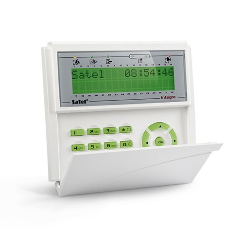 ЖКИ клавиатура для INTEGRA и CA-64, 2 строки по 16 символов, зеленая подсветка, считывание памяти событий: состояние зон, состояние групп, системные часы и дата, расширитель на 2 зоны, RS -232. Потребл. 17мА 140х126х26. С крышкой.