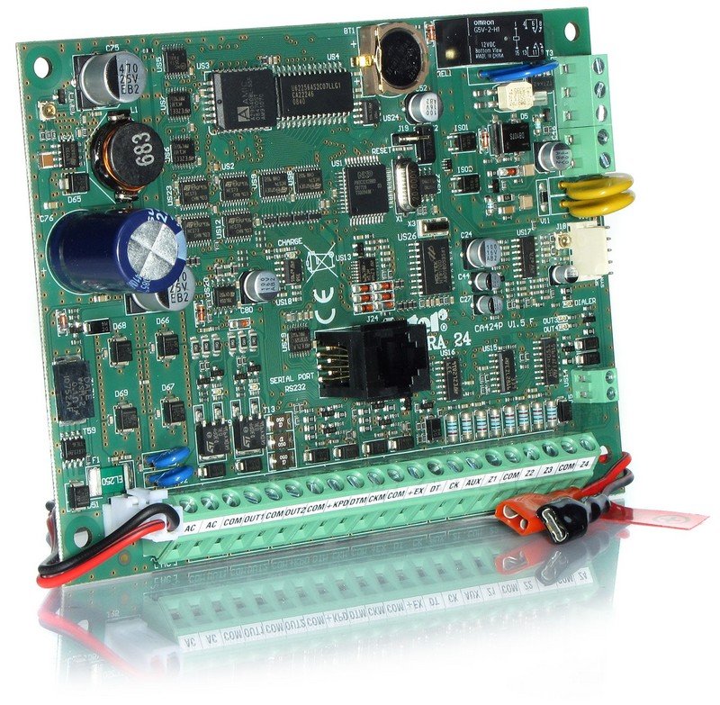 Плата охранно-пожарной сигнализации 4 зоны - расширение до 24 (CA-64E и CA-64EPS, беспроводных до 16), 4 программир. выходов (2 по 1A и 2 по 50мА) расширение до 20 выходов, 1 раздел, 4 подраздела, 16 системных таймеров, 4 телеф. номера для оповещения, 16 голосовых/речевых (1 CA-64SM). Макс. число беспроводных зон и выходов (ACU-100) 16. Устанав. в бокс CA-6 OBU, CA-10 OBU, CA-64 OBU. Питание без периферии 18 VAC, 200 мА. I max нагр= 1,2А