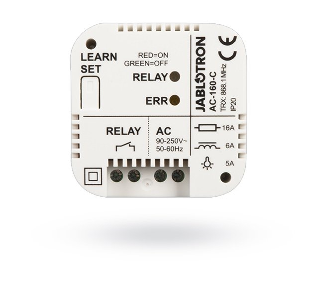 Реле беспроводное универсальное для работы с приборам JABLOTRON 100+; f-раб.868.1МГц; 1 релейный выход, U-коммут.250В, I-коммут.16А; U-пит.100...230В, P-потр.0.7Вт; IP20, t-раб.-10...+40°С, 49x49x26мм