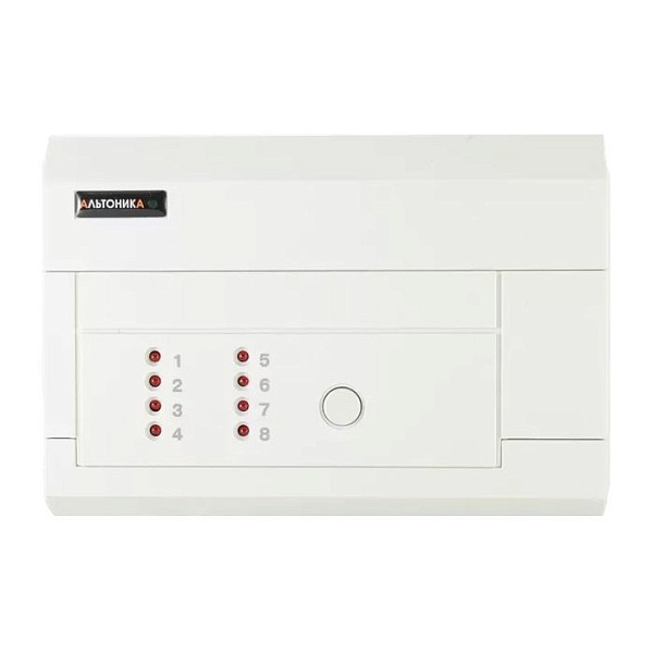 Приемник на 8 передатчиков "Риф Ринг-701" и "Риф Стринг-200", индикация 8 светодиодами, звуковая сигнализация, 1 реле НЗ/НО 12В/2А; U-пит. 10...15 В, I-потр. ≤100 мА, t-раб. -20...+40°С, габ.размеры 110х110х38 мм.