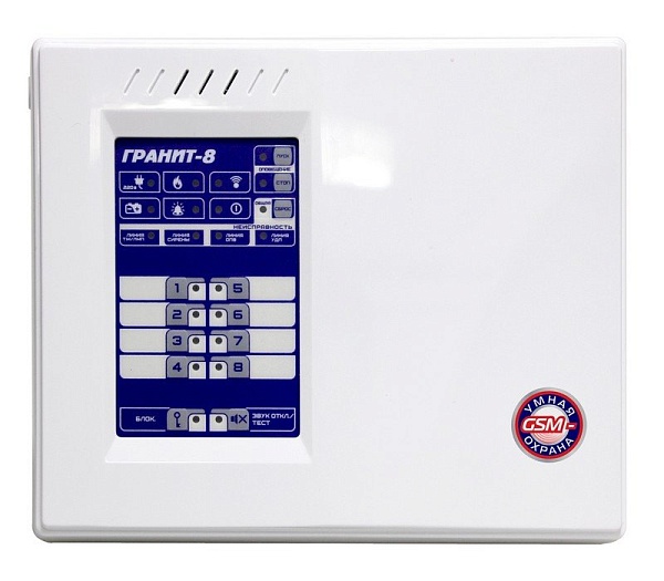 ППКОП, 8 ШС, I-шс. 1.5 мА; 3 вых."ОК": ОПВ-1А, ЛМП-0.2А, СИР-0.3А; ПЦН 1,2,4 - 100В/0.15А, ПЦН 3 - 250В/3А; вых.пит. 12В/1.5А при налич.АКБ; U-пит. 110...242В, Р-потр. 15ВА; под АКБ 12В/7Ач, возм. подкл. внешнего РИП 12В. 2 SIM карты, оповещение по GSM (голос, SMS) до 16 номеров, внутр. GSM-антенна SMА управление кнопками на пан.прибора, ключами ТМ (до 64), SMS-командами, DTMF-командами, программирование через micro-USB, подключение выносного микрофона и 2-х термодатчиков. IP40, t-раб. -30...+50°С, габ.размеры 250х210х80 мм. В комплекте пласт.считыватель ТМ, 2 ключа ТМ.