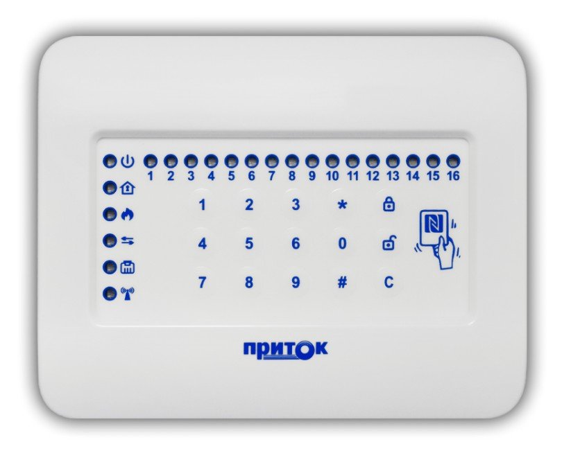 Мембранная клавиатура для работы с приборами Приток-А-КОП на 16 ШС; встроенный считыватель NFC; RS-485, два порта TouchMemory; U-пит.10.2...14.5 В, I-потр.200 мА; t-раб.-10...+45°С, 160х128х32 мм