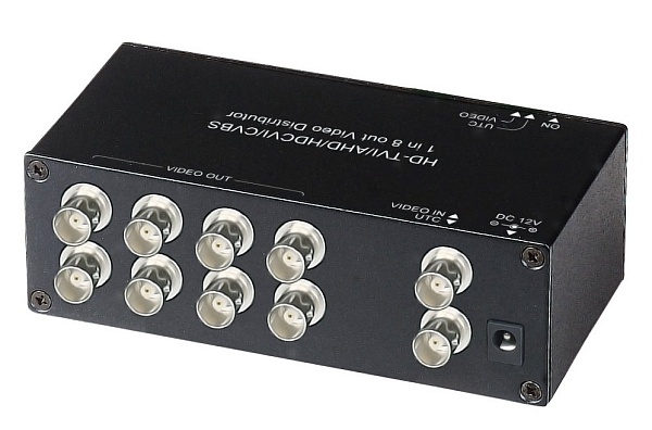Разветвитель видеосигнала HDCVI/HDTVI/AHD (Максимальное разрешение до 5МП); 1 вход - 8 выходов; Полоса пропускания до 100МГц ; Возможность передавать по одному каналу HD-видеокамере сигналы управления (UTC) от регистратора по одному коаксиальному кабелю вместе с видеосигналом; Защита от перенапряжения(TVS); DC 12В /500мА (БП в комплекте); -40°...+55°C; 133x44x75мм; Рекомендуемый кабель RG59/RG6