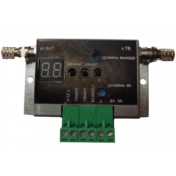 Модулятор телевизионный цифровой; видеовход-1, аудиовход-1; диапазон рабочих частот 110-857МГц; V-вх= 85дБ/мкВ, f-подн.звука = 6,5/5,5 МГц, V-вх.звук=0,78 В, затухание проходное < 2,5 дБ; DC 12В, 80 мА