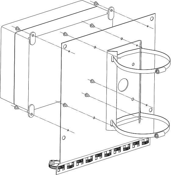 Кронштейн крепления блока питания БПУ-3-220VAC-24VAC/10А на квадратные и круглые опоры Ø  115 ÷ 135 мм и крепления (фиксации) подводящих кабелей или металлорукавов, 320х280х33 мм.