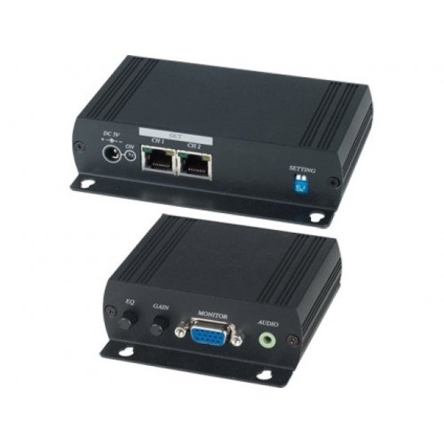 Комплект (передатчик T+ приемник R) для усиления и каскадной передачи VGA-сигнала (до 1600х1200 @85Hz) и стерео аудиосигнала. Дальность передачи: 300 м (цв. сигнал) на каждый каскад. 1 Видеовход 15-Pin (скв), 1 аудиовход (скв). 1 выход RJ-45.