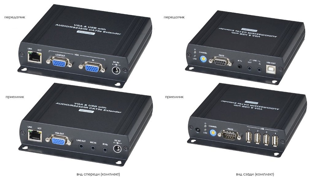 Комплект (приёмник и передатчик) для передачи VGA, 4xUSB2.0, RS232, Стерео Аудио и ИК-управление на расстояние до 120м (CAT5e)/140м (CAT6); При использовании повторителя SR01 (через каждые 100м) расстояние передачи неограниченно; Разрешение до 1920х1200, скорость передачи данных до 850Мбит/с (High Speed); Устройство предназначено для работы с PC и регистраторами на базе ОС Windows/Linux с драйверами для работы USB-хаба.; В комплекте БП DC5V (2А)- 2 шт; 125х30х140мм; -40°...+55°C.