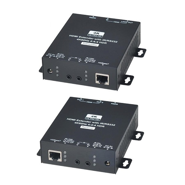 Комплект (передатчик + приёмник) для передачи HDMI + ИК управление + RS232 по одному кабелю витой пары CAT5e/6(HDBaseT) на расстояние до 70м (1080p, 60Гц, 12бит, 3D), до 40м(4K(60Гц), 4:4:4, HDR); Поддержка версии HDMI 2.0 и HDCP 2.2; Функция разветвителя HDMI(два выхода у приемника), дополнительный выход HDMI у передатчика; Поддержка аудио: LPCM 7.1 х 192кГц, Dolby TrueHD, DTS-HD MA; Передача RS232 и ИК сигнала может осуществляться в прямом или обратном направлении; Скорость передачи данных RS232 до 115200бит/с (дуплекс); Передатчик: Вх. - HDMI(A)/DB9(F)(RS232)/TRS 3.5мм (ИК)х2/DC5V. Вых. - HDMI(A)/RJ45. Приёмник: Вх. - RJ45/DB9(M)(RS232)/TRS 3.5мм (ИК)х2/DC5V. Вых. - HDMI(A)x2; DC5В/2000мА(Блок питания в комплекте- 2шт.) ; 109.5х30х109.6мм.; -40°...+55° С.