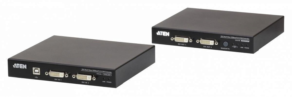 Удлинитель, KVM USB, 2xDVI Single Link+KBD&MOUSE USB+AUDIO+RS232, 1920х1200 до 100м, 1xUTP Cat5e/HDBaseT, с KVM-шнуром USB DVI-D 1x1.8м, 2xБП DC 5В/2400мА, 0…+40°C, 174x160x29мм.