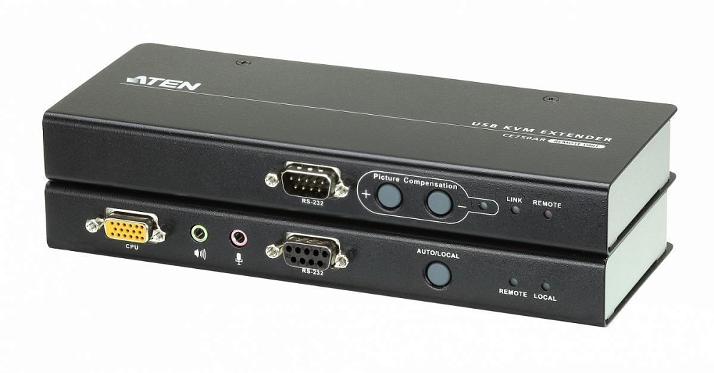 Удлинитель, KVM USB+AUDIO+RS232, 1920х1200 до 30м, 1600х1200 до 150м, 1280х1024 до 200м, 1xUTP Cat5e, c KVM-шнуром USB, 2xБП DC 5.3В/670мА, 0…+50°C, 202x81x25мм.