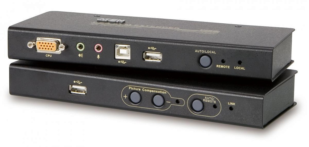 Удлинитель, KVM USB+AUDIO, HD-DB15+3xUSB A-тип+2xMINI JACK, 1920х1200 до 30м, 1600х1200 до 150м, 1024х768 до 250м, 1xUTP Cat5e, c KVM-шнуром USB, 2xБП DC 5В/1200мА, 0…+50°C, 202x81x26мм.