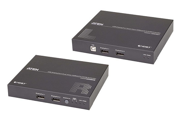 Удлинитель, KVM USB, 2xDP+KBD&MOUSE USB+AUDIO+RS232, 4096x2160/3840x2160 до 100 м, 1920х1200 до 150м, 1xUTP Cat5e/HDBaseT, с набором шнуров 1.5м, 2xБП DC 12В/820мА, 0…+40°C, 174x156x29мм.