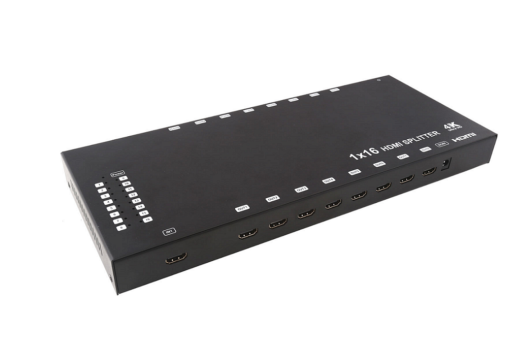 Разветвитель HDMI (1вх./16вых.), с поддержкой 3D. Поддерживает разрешение до 1080p/60Гц/36бит и 4Kx2K/30Гц, звук DTS-HD/true-HD/LPCM7.1/AC3/DTS/DSD. Вх. - HDMI(A)/Роз.2,1х5мм(DC5V). Вых. - HDMI(A)x16 ; DC5В/4000мА(в комплекте); 350x147x40мм; -5…+35°С.