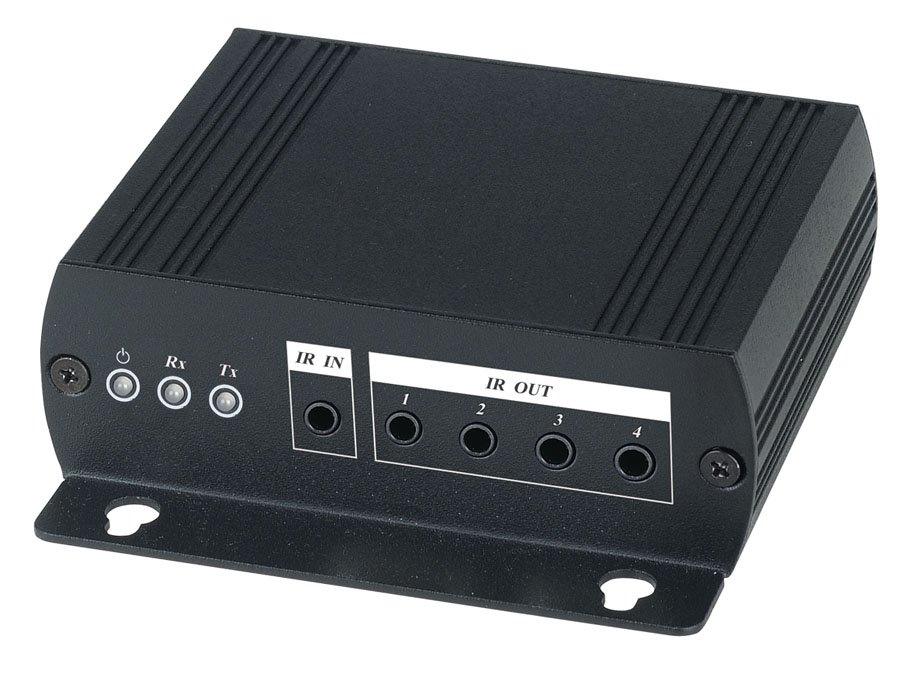 Комплект для передачи сигнала ИК управления по одному кабелю витой пары CAT5 (и выше) на расстояние до 1200м; Поддерживает двунаправленную передачу; Два приёмопередатчика: 1 ИК вход + 4 ИК выхода, 1 порт RJ-45; DC12В /500мА (БП в комплекте)можно использовать как с приёмником, так и с передатчиком)); -40°...+55°C; 95х30х88мм