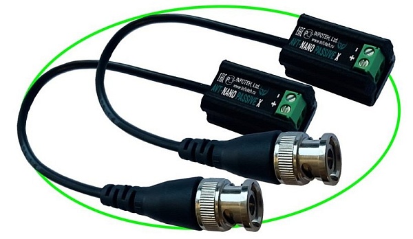 Комплект пассивных миниатюрных приемопередатчиков 4K/5Мp/4Мp/1080p/720p AHD/TVI/CVI по витой паре; Полоса пропускания – 85 МГц; Дальность передачи по UTP Cat 5e/6: 720p – до 500 метров, 1080p – до 400 метров, 5Mp/4Mp 15 к/с – до 400 метров, 5Mp/4Mp 25 к/с – до 300 метров, 4K – до 200 метров; Затухание - 0,3 dB; Коэффициент передачи - 0,97; Подавление помех - 100 dB; Защита от импульсных перенапряжений; -40°…+50°C; 30×16х13,5мм.; Разъем BNC на коаксиальном кабеле 10 см.
