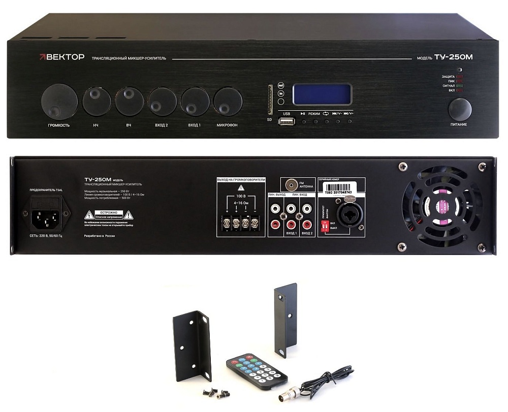 Комбинированный микшер-усилитель. Мощность 250 Вт. Выход 100 В/4-16 Ом, 1 микр и 2 AUX входа, 1 AUX выход. Цифровой FM тюнер, MP3 плеер, USB, SD, Bluetooth. Питание 220 В. Размеры 482х88х410 мм.
