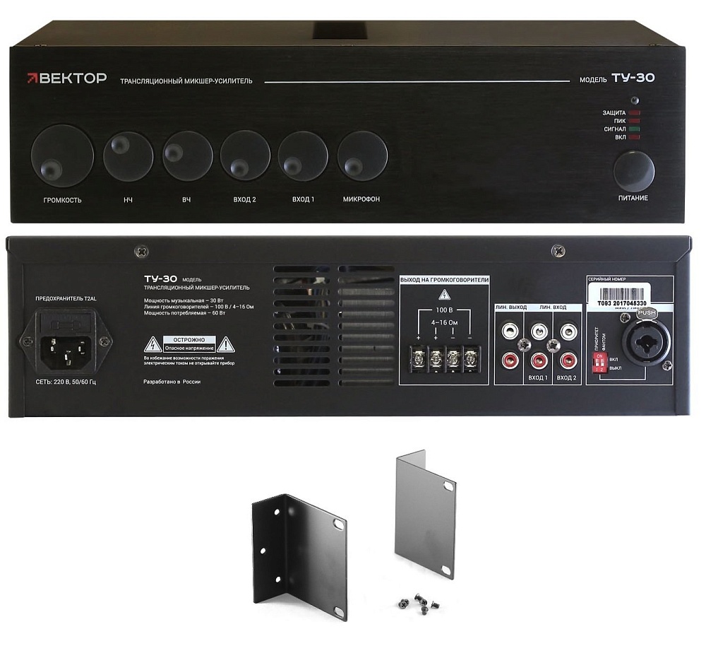 Микшер-усилитель. Мощность 30Вт. Выход 100В\4-16Ом, 1 микр и 2 AUX входа, 1 AUX выход, 330 х 88 х 250 мм, вес 3.6 кг.