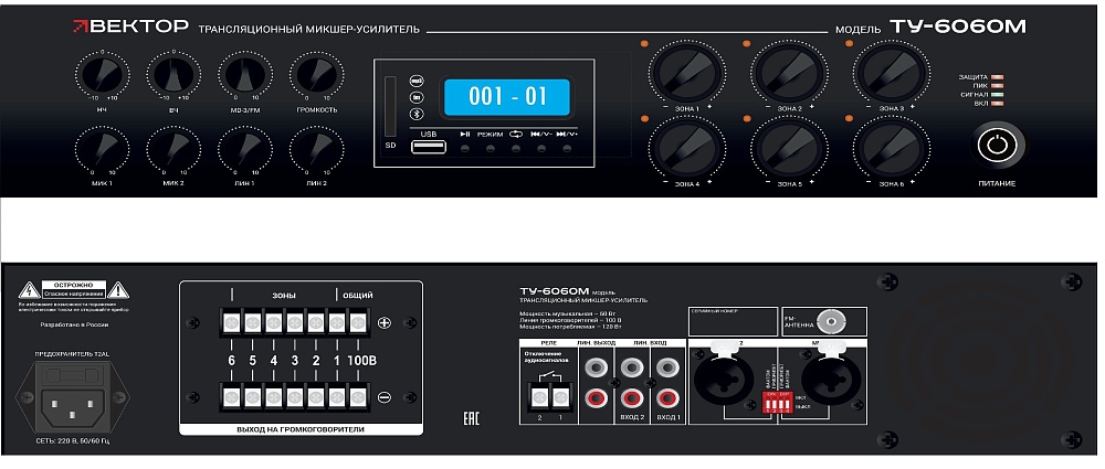 6 зон, AM\FM тюнер, MP3 плеер, 350 вт/100В, регулировка уровня каждого выходного сигнала. 2 микр, с фантомным питанием и выбором приоритета 2 лин входа, 1 Aux вых. ,ИК-пульт в комплекте. Функция аварийного отключения, 220В, рэковое крепление в комплекте, 482х88х400 мм. Вес 16,5 кг.