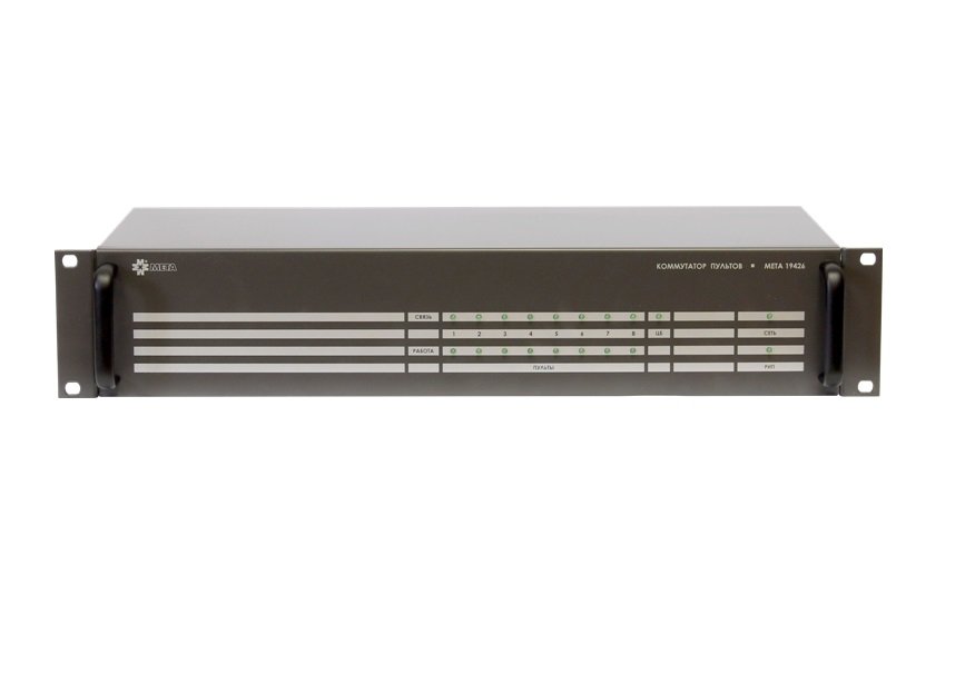 Коммутатор пультов (до 8 пультов) для подключения пультов МЕТА 18580 к ПУО МЕТА 17820\17821\19830, монтаж в стойку 19", 8 уровней приоритета для каждого из пультов, уровень выходного сигнала 0,775 В, 100-10000 Гц, RS485, длина линии связи до 500 м, 220 В 50 Гц, 12 Вт, резервное питание 24 В, 0,4 А
