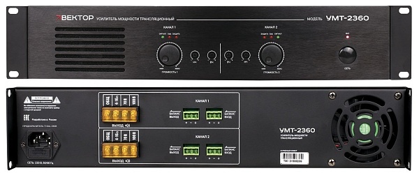 Усилитель мощности 2х360 Вт, линия 100 В, 70 В или 4-16 Ом. Линейный вход, линейный выход. Индикация режимов работы усилителя. Регулировка уровня выходного сигнала, регулировка НЧ/ВЧ, многоступенчатая защита. Питание 220-230 В/50-60 Гц. Высота 2U. 483х88х397 мм. Вес 21 кг